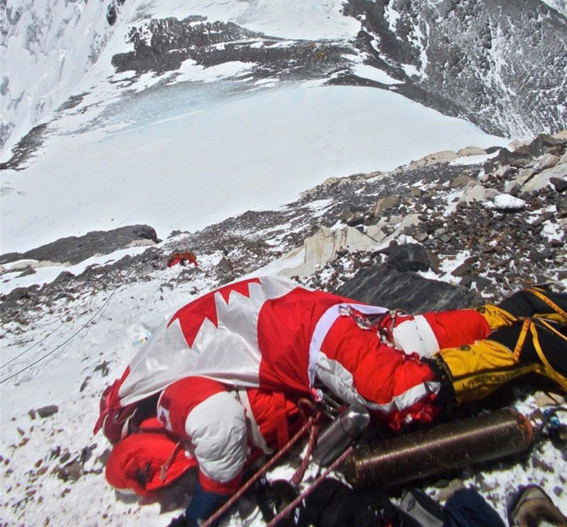 Lhakpa Sherpa said that she saw seven dead bodies on her latest 2018 summit – one whose hair was still blowing in the wind. Elia Saikaly recalls hundreds of people climbing over the body of a recently deceased climber. Mark Jenkins talks about walking past four newly dead bodies on his descent from the summit in 2013.